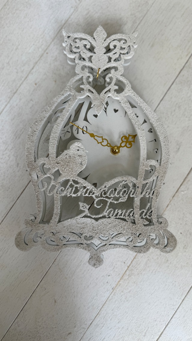 2025年7月24日(木) 関西ネットワークテン あなたのお悩み解決しますの出演テーマに沿って作った作品です 高校の時の通学路玉出商店街で流れた、 きぎの青春と友情が盛り込まれた曲を探すために、ごえさんと製作スタッフさんと旅します。 最後、たどり着いた作曲者様へ、感謝の気持ちを込めて贈らせてもらった作品。 10チャンネルに忖度して、時計版10だけを書きました(笑) ローマ字で「うちの小鳥もたまで」と綴っています 英語変換しようかと思ったんですが、「たま」という名前と「です」のいみの「で」が 英語ではこのダジャレ感が全然でないので、あえて音だけをローマ字で。 単なる雑貨時計としてではなく、 作家として作品にいろんなものを詰め込めた作品として、 この掛時計を世にだせたと思っています 裏に三角カンがついてて壁に飾れます むにゅむにゅ2枚重ねにしているので、厚みもあり豪華です サイズ約約W170 D40 H266mm 素材 MDF 水性塗料 鳥籠ムニュムニュ1点のみのお値段です。 その他は、撮影小物のため、商品には含まれません。